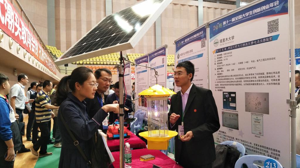 据统计,2017年“国创计划”共收录国家级1300余项,本届年会共收悉部署高校和地方教育主管部门推荐项目833项目,其中学术论文392篇,展示项目441项。经过相关学科专家初评、"国创计划"专家组、协作组复选,遴选出参加第十一届全国大学生创新创业年会的学术论文176篇,创新创业展示项目218项,共计394项。经第十一届全国大学生创新创业年会组委会的层层遴选,我校国家级大创项目入选《第十一届全国大学生创新创业年会成果集》,张文瑜、侯玉龙两位同学分别对《南疆深度贫困区精准扶贫实施效果评价》、《新疆兵团棉花生产的适度规模经营――基于265份农户调研数据》进行现场汇报,张景川老师和苏育珍同学对《枣园可控光引诱高压静电杀虫器装置》项目进行展示讲解,其中苏育珍同学的科技发明类项目获得了"最佳创意奖"的佳绩。