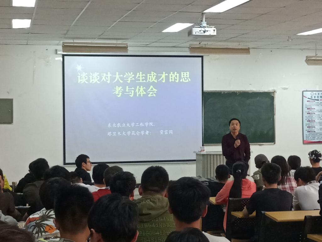 贾富国教授为学生做了关于《谈谈对大学生成才的思考与体会》的报告,通过自己如何将研究生曾勇(肉漫画
