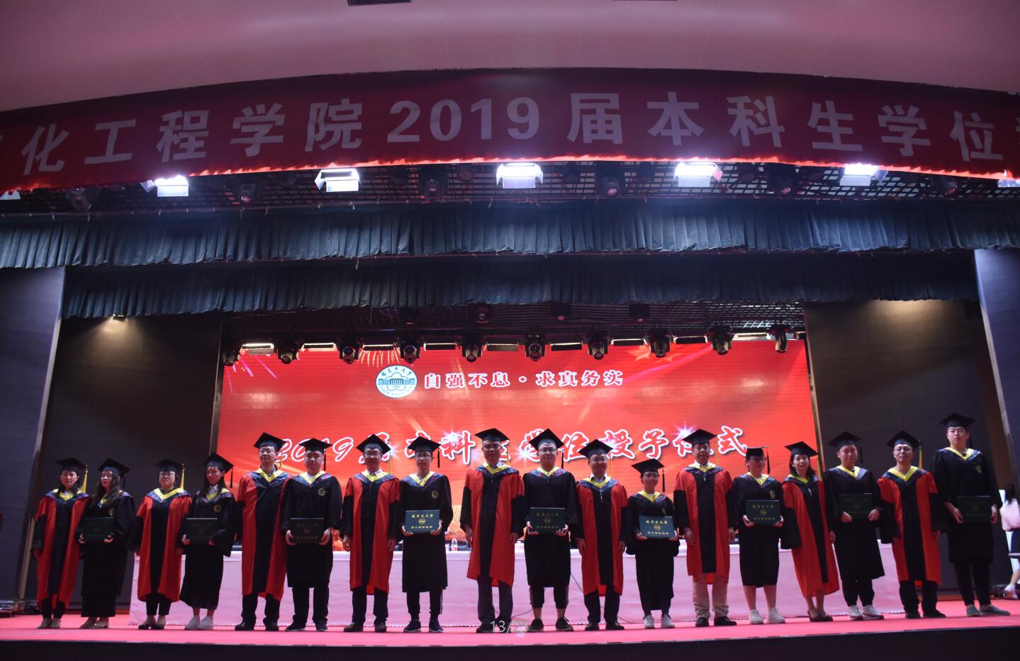 2019届本科毕业生学士学位授予的决定》,毕业生们依次上台,学院领导、各系主任为本科毕业生扶正流苏、授予学位并合影留念。