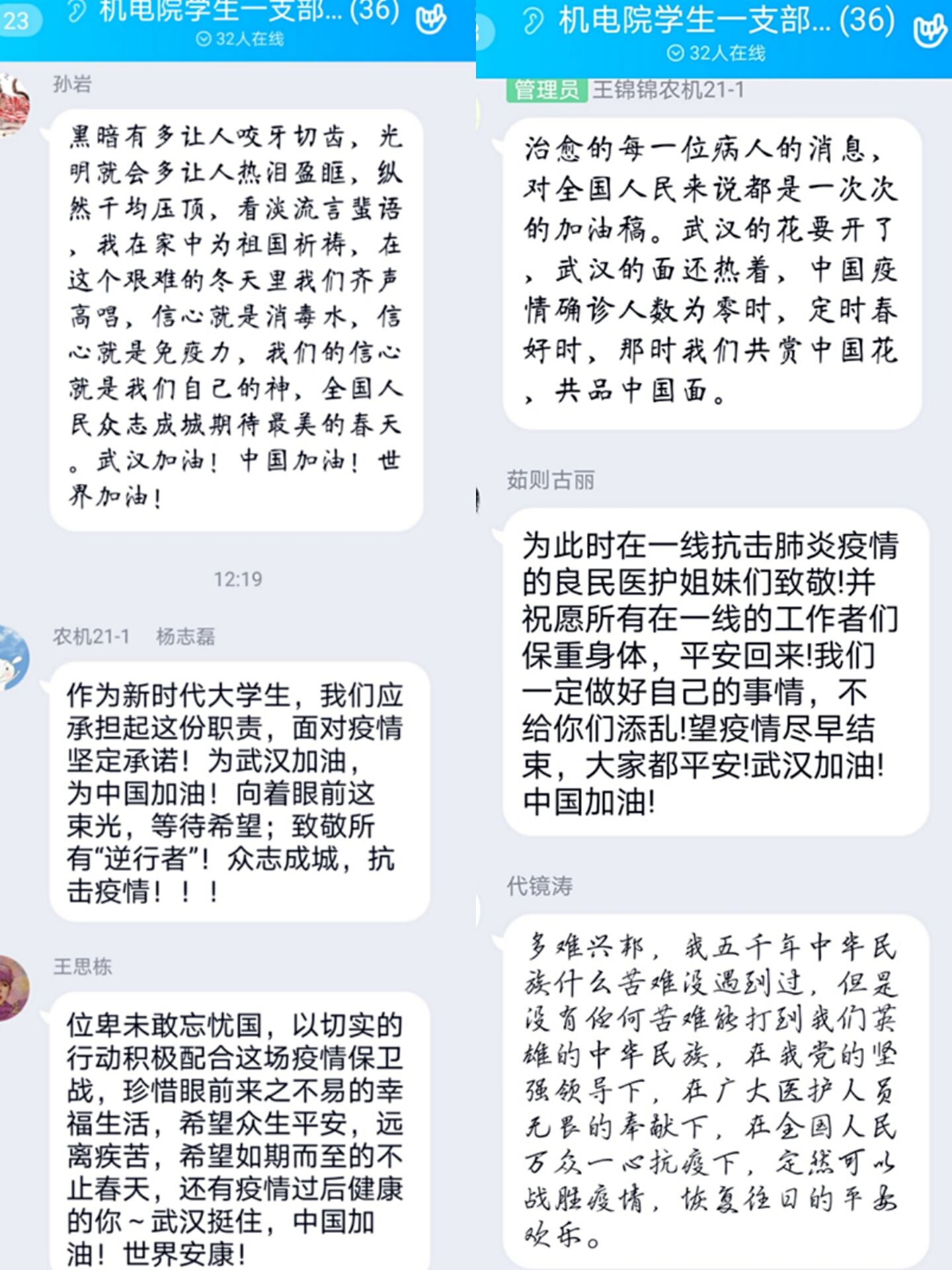 最后,张哲总结表示,学生党员要主动作为,发挥党员先锋模范,以实际行动践行“一个支部就是一座堡垒,一名党员就是一面旗帜”的精神,以实际行动传承和发扬“胡杨精神”,在党的带领下为取得疫情防控攻坚战的最终胜利而奋斗。
