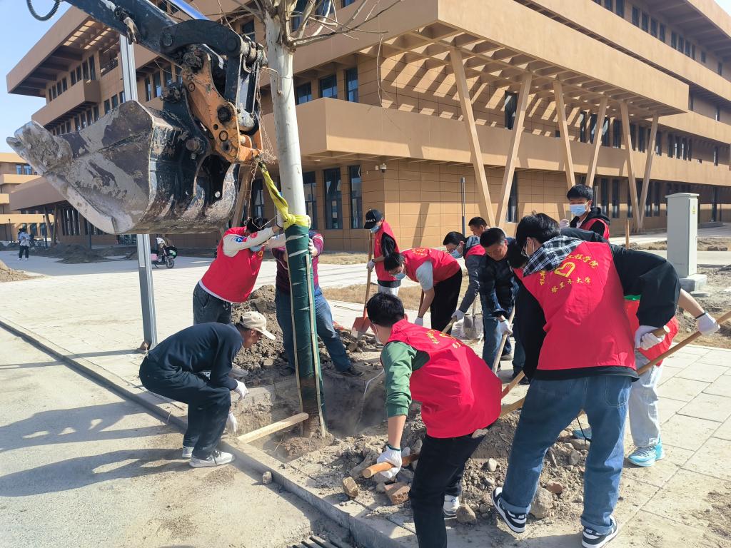 植树现场,志愿者们以饱满的热情投入到植树劳动之中,挥锹铲土、扶直大树、培实新土,每道工序都认真细致,一丝不苟,处处都是忙碌的身影。在大家的努力之下,50棵大树在春风中昂然挺立,焕发出勃勃生机,为学院增添了清新的绿意。