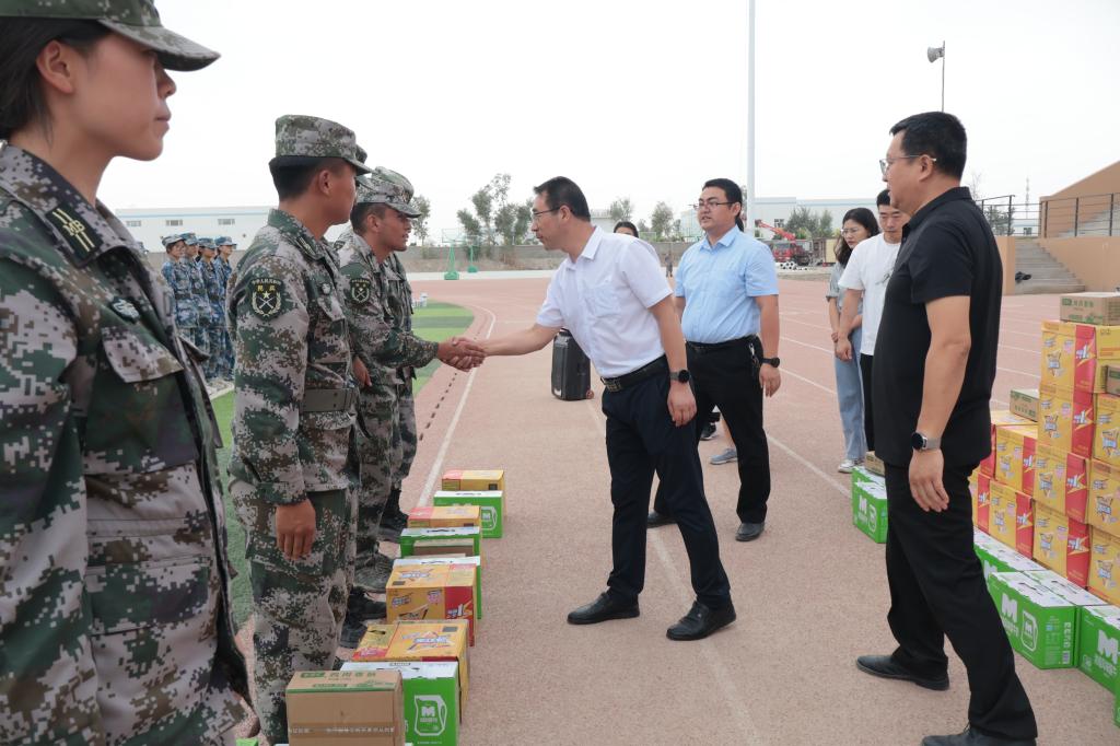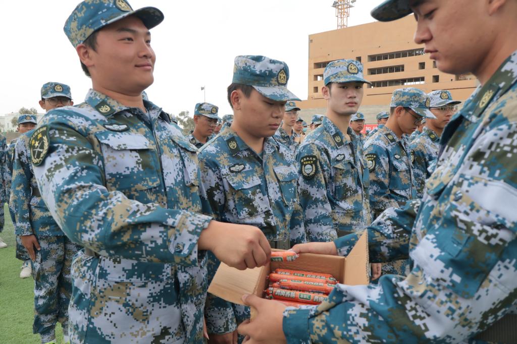 一声声口号在训练场上回响,展现了机电学子蓬勃向上的精神面貌。王旭峰代表学院全体师生向承训教官及指导员的工作表示感谢,向全体参训的同学们表示亲切的问候,并对同学们高昂的军训热情和端正的训练态度表示高度的肯定和赞扬。他表示,军训既是大学教育的必修课,同时也是磨砺意志、增强体魄的关键一课。随后,学院党委书记王旭峰代表学院为承训教官和参训学生分发了牛奶等慰问品,给大家带来学院的问候与温暖。