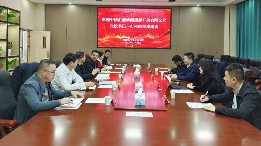 王旭峰对张松书记一行的到来表示热烈欢迎,共同观看了学院宣传片,并就学院当前的发展现状、学科建设、人才培养、科学研究等进行了详细介绍,对中核汇能新疆能源开发有限公司近些年取得的跨越式发展和成就表示赞赏,希望以此次交流为契机,进一步加强校企合作,充分发挥优秀资源,实现发展共赢。李勇就学院毕业生就业情况、推动学生就业工作进行详细介绍,希望双方进一步促进产教融合,加强交流。