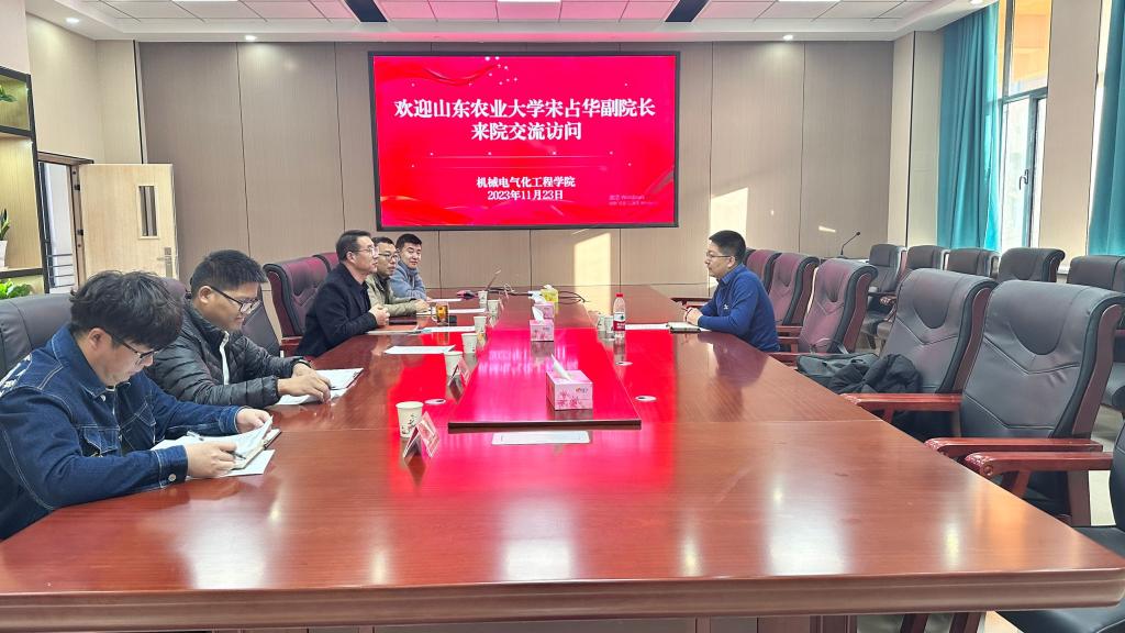 11月23日上午,山东农业大学机械与电子工程学院宋占华副院长来院访问交流,与学院党委书记王旭峰、学院党委委员农业工程党总支书记范修文、及农业工程系教师代表进行座谈交流,会议在新校区一期D323会议室举行,由王旭峰主持。