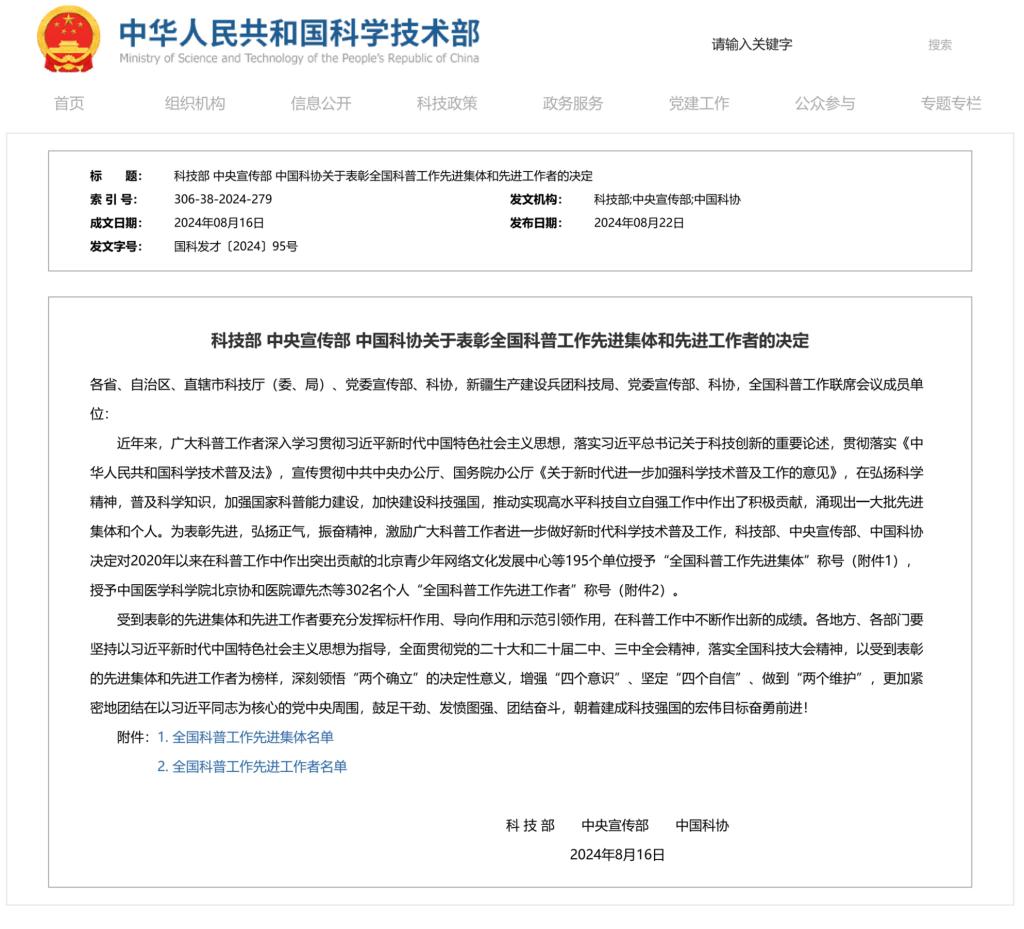 近日,科技部、中央宣传部、中国科协发布《关于表彰全国科普工作先进集体和先进工作者的决定》,对2020年以来在科普工作中作出突出贡献的195个单位和302名个人授予“全国科普工作先进集体”和“全国科普工作先进工作者”荣誉称号。其中,肉漫画