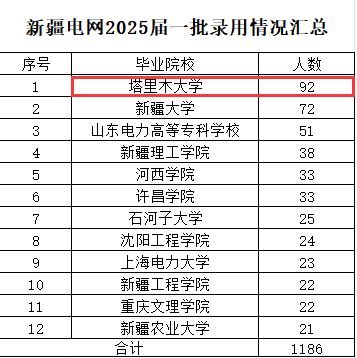 1月20日,国网新疆电力有限公司公布了2025年第一批高校毕业生的录取结果。在众多高校中,我校毕业生的表现尤为突出,录取人数达92人,稳居榜首。